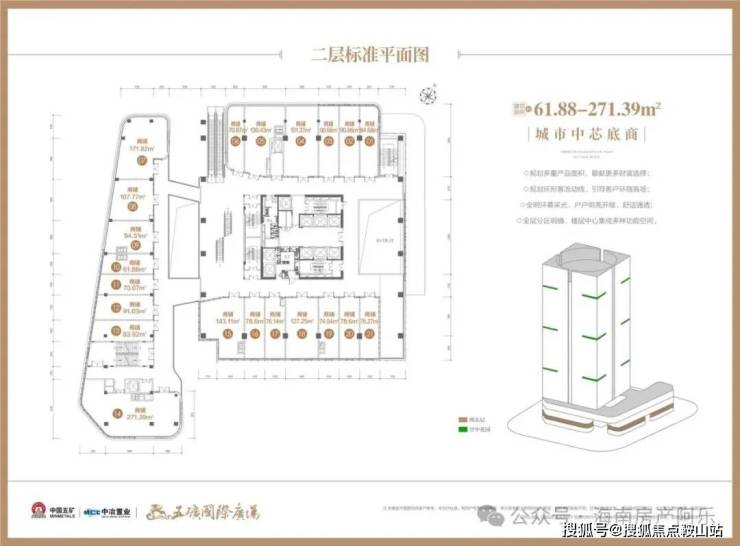 【楼栋概况】楼体高度110米,地下二层地上22层,1-4层为城市中芯底商,首层层高约6米、2层层高约为4.5米、3/4层层高约为4.35米;5至18层为国际商务空间,层高约为4.2米。