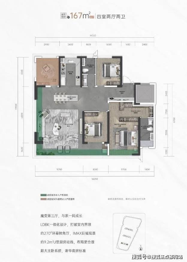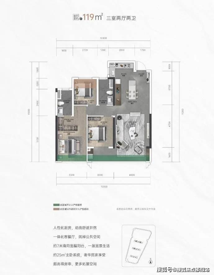 其中3号楼169 端厅户型,更是270°最大化利用南向七里河景观;南向全飘窗设计,北向阳台最大化设置,最大化提升赠送率,实际得房率高达85-88%,增加实际可使用面积。