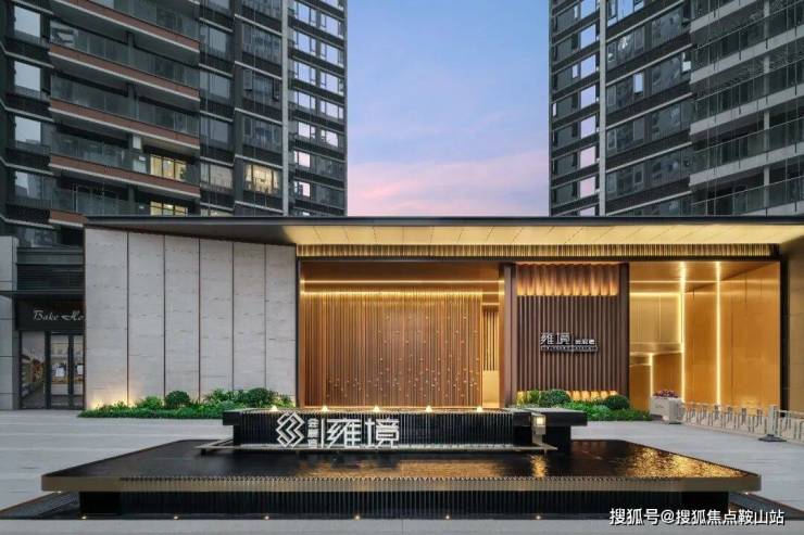 走近小区,约25米的主入口大门雍容大气,将石材、水景、铝格栅等元素巧妙结合,宛如星级酒店大门。