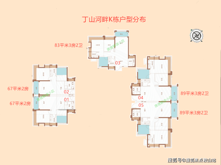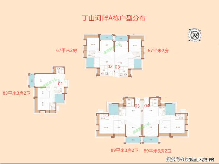 A栋总层高32层,2梯5户。各位注意看右上角的指南针辨别户型朝向。01户型67平米朝西北,02-03户型83平米朝东北,04-05户型89平米朝南,传统经典户型(我这里角度没有调整好)。