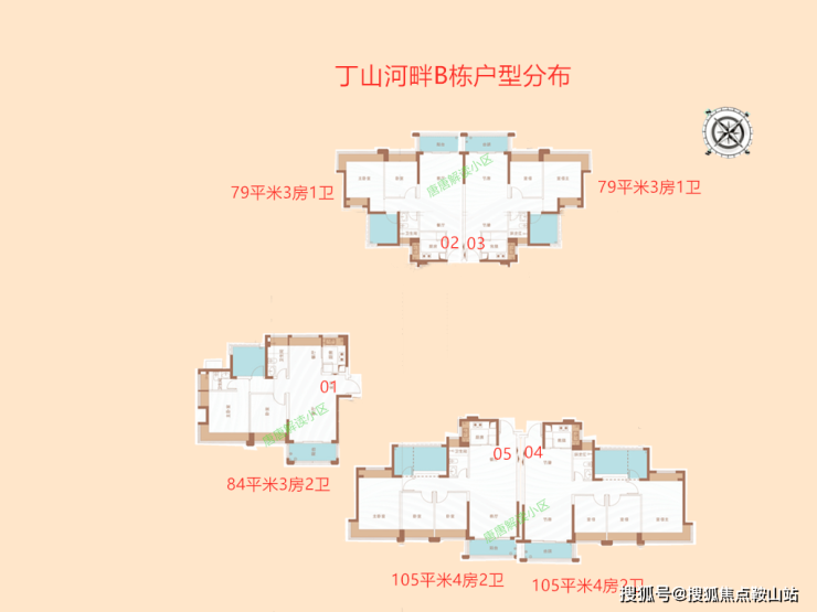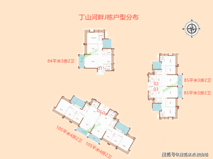J栋总层高32层,2梯5户型。01户型84平米东西通透,02-03户型85平米朝东。04-05户105平米朝西南,看河畔景观。