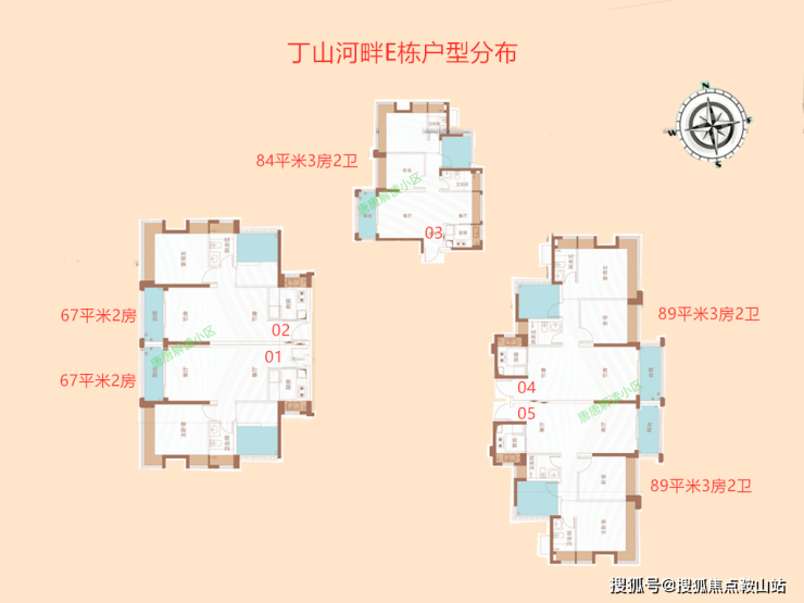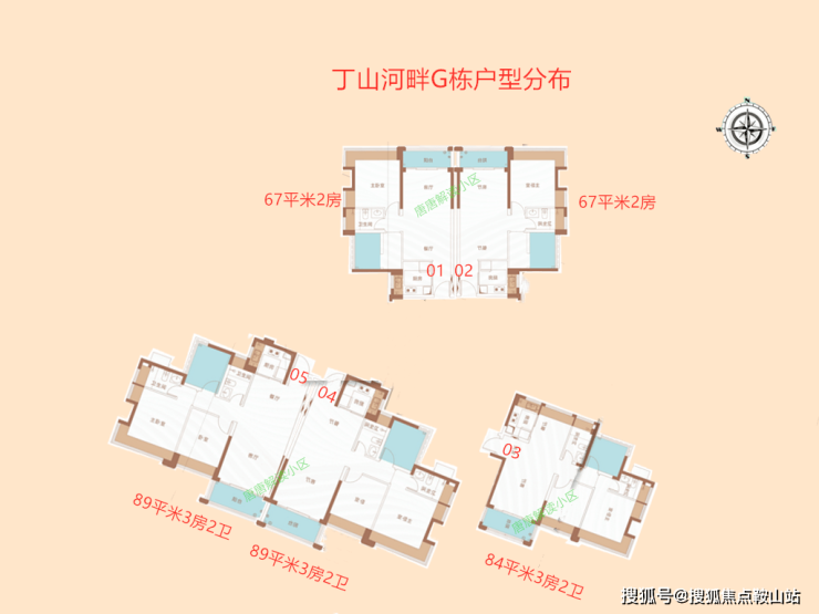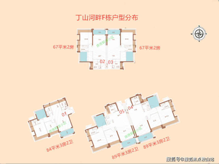 F栋总层高31层,2梯5户。01户型84平米3房2卫南北通透,02-03户型67平米2房朝北。04-05户型89平米传统户型朝东南。