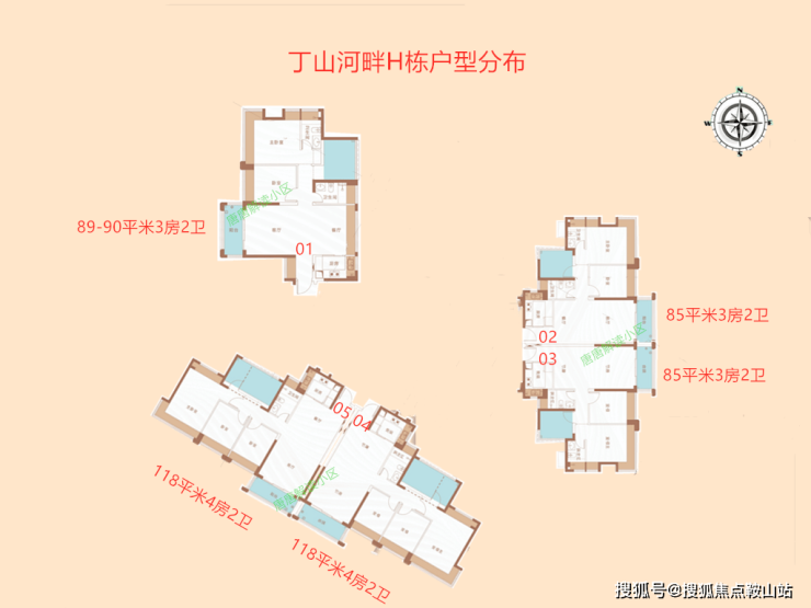 H栋总层高33层,2梯5户。01户型89平米3房2卫东西通透,02-03户型85平米3房2卫朝东,04-05户型118平米4房2卫,朝西南,是105平米放大版,也是3个卧室朝南,一个卧室朝北。南面有事丁山河,视野景观都很不错。