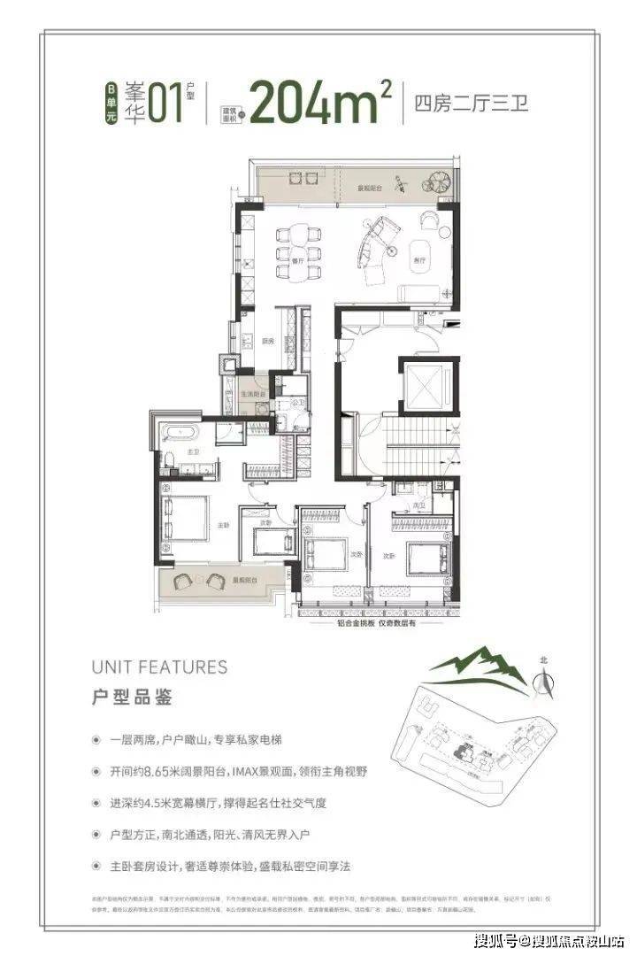 同样的专梯入户,豪宅感扑面而来,该户型为顶级大户型,四阳台设计,最大有10.55米的景观阳台和180度视野的餐客厅空间奢阔气场尽显,罕见的南北瞰景四阳台设计,让家的每个角落都能欣赏美丽的山景和城市景观。所有的开窗面都尽可能放大,客餐厅、书房、卧室、几乎都能享受超宽超大屏