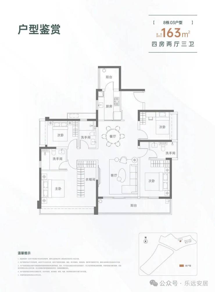 163㎡的4房2厅3卫,设计的是竖厅格局,一梯一户,进门入户玄关,LDKB一体化设计,三开间朝南,双主卧套房,客厅连接次卧出大阳台,L型厨房还带1个生活阳台,卫生间干湿分离,得房率约82%(不含赠送),东南朝向。