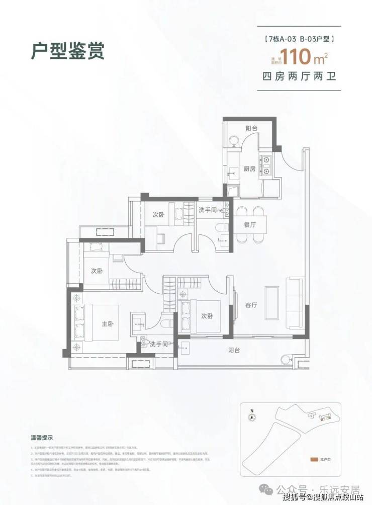 110㎡的4房2厅2卫,设计的是经典竖厅格局,进门入户玄关,LDKB一体化设计,四开间朝南,动静分区,客厅连接次卧出大阳台,L型厨房还带1个生活阳台,卫生间干湿分离,得房率约82%(不含赠送),东南朝向。