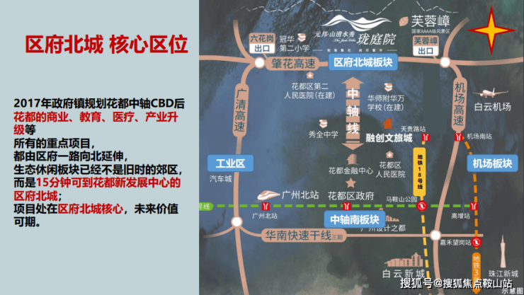 项目交通篇;多维立体交通,出行便捷,项目南侧为山前旅游大道,距肇花高速六花岗出口仅600米,无缝接驳大广高速、机场高速、京港澳高速、广清高速等南北主干线。15分钟直达融创文旅城、广州东环城际,20分钟到白云国际机场,40分钟即达白云新城,50分钟可达珠江新城;享受珠三角一小时生活圈