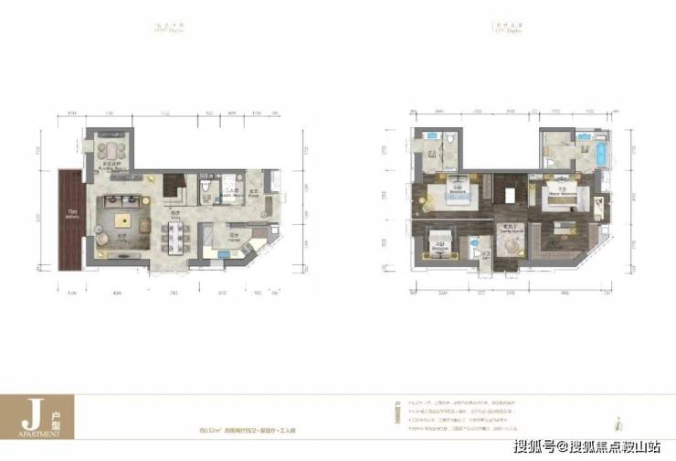 J 户型约为 152㎡,做到了 3 套房 2 厅 3 卫+2 功能房,并拥有东、南、西三面 270° 采光观景。