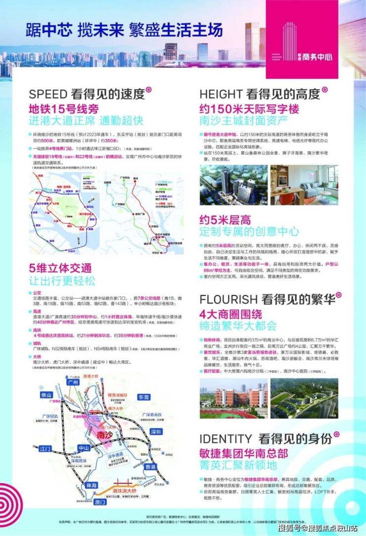 3⃣高速:已开通的南沙港快速、广澳高速、南二环高速、连通南沙大道、虎门大桥,畅通广州、东莞、中山,即将开通的深中大道、南中高速,无缝连接中山、深圳、珠海、澳门等地,2019年4月份南沙大桥的开通,实现了30分钟到深圳宝安机场、前海地区。12月开通南沙至香港直通大巴,南沙到香港国际机场的时间将在2小时左右,进一步方便南沙居民来往香港,南沙上车点在南沙喜来登酒店,距离项目10分钟车程;