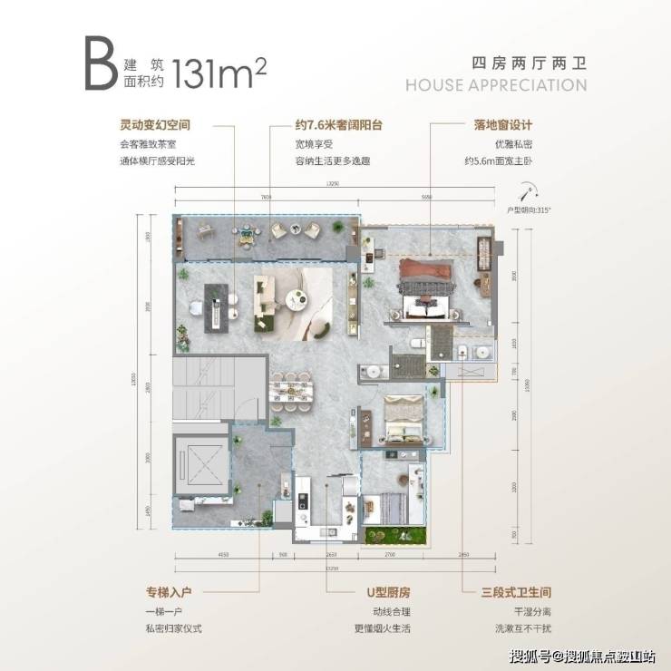 B户型: 约131㎡四房两厅两卫