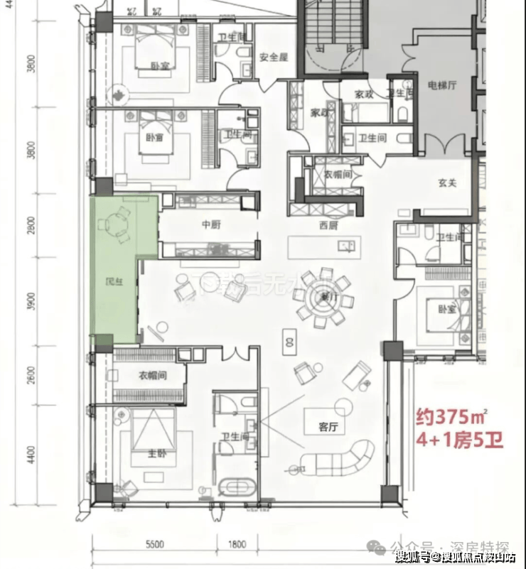 · 370-375㎡户型: 4+1房五卫设计,配备家庭厅和家政套间,适合有多样化生活需求的高净值家庭。