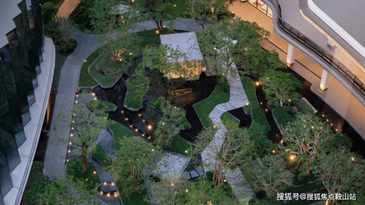 水流从入口叠水瀑布倾泻而下,奔向中央镜面水池,再沿着步道溪流蜿蜒流至全园各处,业主们沿着步道漫步,能依次体验 “听水的舒缓、观水的灵动、亲水的惬意”,这是传统平面园林没有的感受。