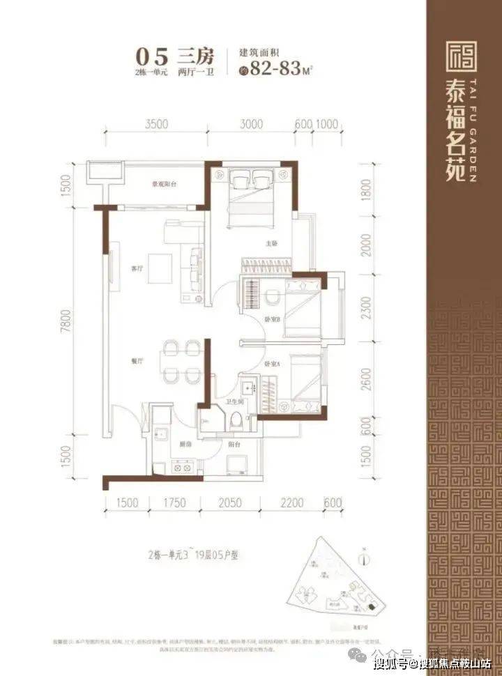 建面约82-83㎡的3房2厅1卫户型,在保证空间尺度感的前提下做到3个房间,实用性高