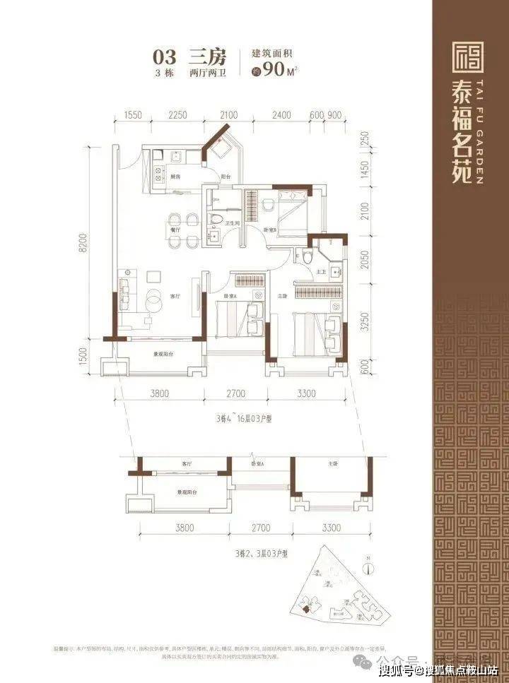 90-102㎡的3房2厅2卫户型。这几个户型都是在主人房多设计一个卫生间,私密性更强,也让家人间的生活更加方便。