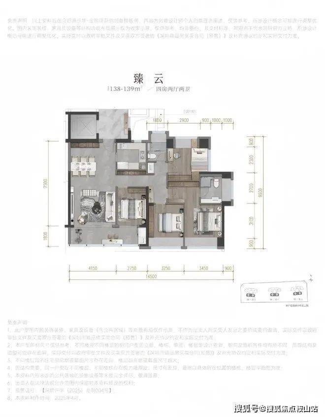 138-139㎡:四房两厅两卫,精装交付,总价约666-737万/套。
