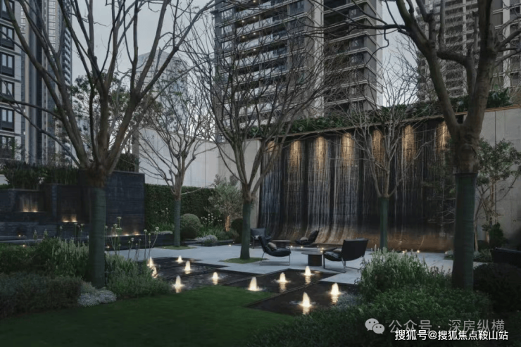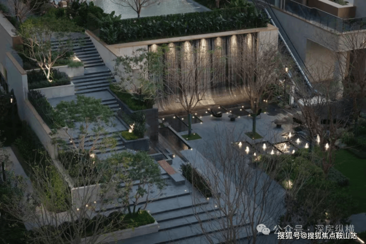 星空下的水幕花园,借鉴佩雷公园,巧妙地将现代景观元素与自然气息相融合,形成归家口袋花园,带来视觉与听觉上的双重享受。