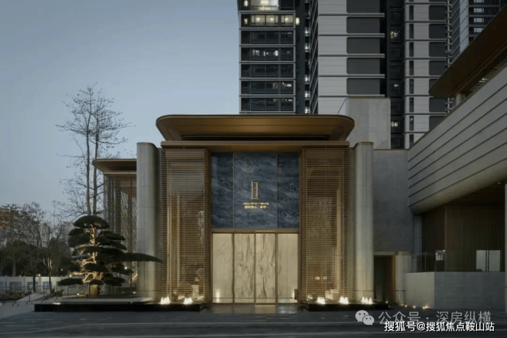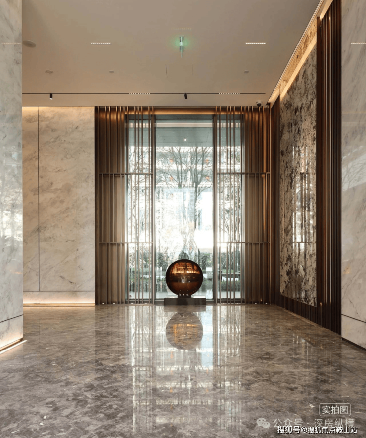 入户大堂两侧屏风带来酒店式归家体验感,室内与室外相互融合,格栅与室外结合打造东方韵味造景;墙面与地面两种石材搭配,细节的金属线和柔和的灯光与空间融为一体,灵动通透、宽敞明亮,在扩大空间尺度的同时营造出归家的舒适与温暖感。