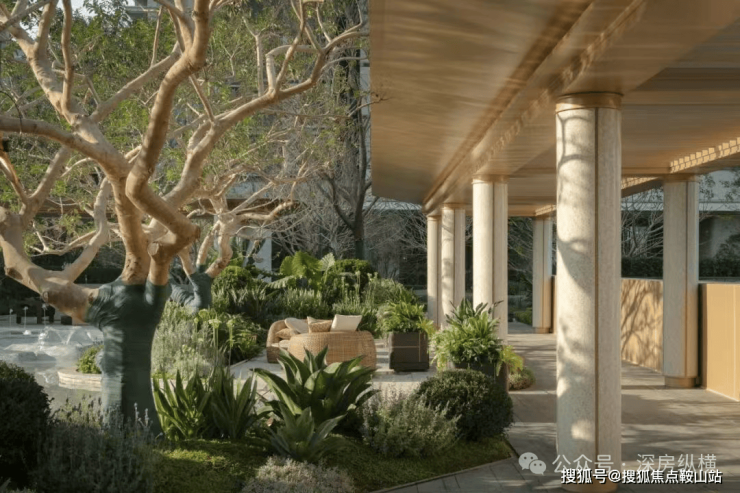 气势恢宏的礼序与酒店品质的精工,皆是对酒店式入口的深度解读。一棵特选造型罗汉松宛如一位气宇轩昂的守护者,枝繁叶茂,苍劲挺拔。不仅是空间独特的灵魂,更是从繁华都市进入隐逸居家的优雅过渡。