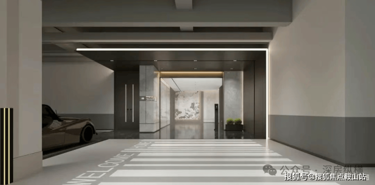地下入户大堂结合灯光氛围,增加昭示性。大堂地面材质延伸至泛大堂地面,强调归家专属空间,实现归家的礼仪过渡。具有标识性的入户门头实现精致迎宾体验感。酒店级别打造地下入户仪式感。