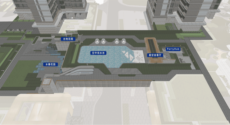 空中戏水池链接社区南北向空中通道,居住者能享受到无与伦比的广阔视野。戏水池如同一条蓝色的丝带,优雅地悬浮在高空之中,水面波光粼粼,映照着湛蓝的天空,仿佛是天空与大地的完美交汇。