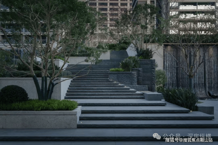 层次感台阶与瀑布水景共同构建了一个富有节奏感的立面空间,台阶的递进与水流的倾泻相互呼应,呈现出一种流动与静谧并存的美学效果。