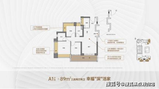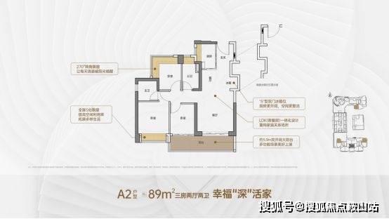 客厅约3.5米开间,LDK一体化设计,约5.9米双开间大阳台,主卧双面飘窗,全屋6面飘窗。