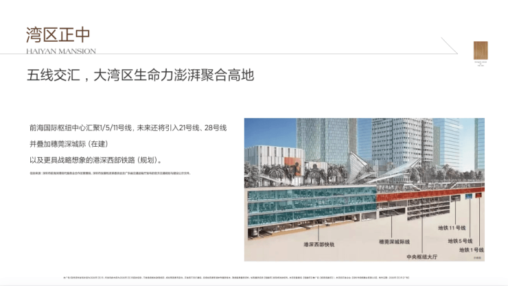 地块北侧临河,西面瞰海,临近在建前海国际枢纽中心,未来这里将汇集3条地铁线(1号线、5号线、11号线)与2条城际线(穗莞深城际、规划港深西部铁路)。