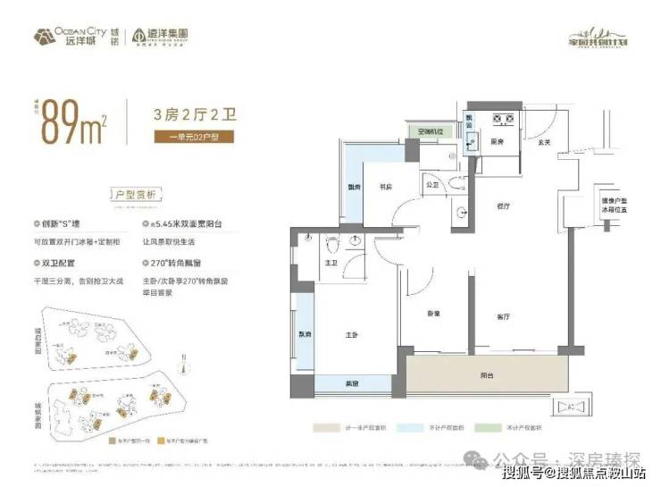 89㎡的3房2厅2卫,设计的是经典竖厅格局,客厅3.154米开间,客餐厅约18.8㎡,LDKB一体化,S墙设计预留冰箱卡槽位,动静分区,分别做到了主卧13.66㎡/次卧7.04㎡/次卧6.28㎡(实测面积,去掉墙体),主卧+1个次卧270°飘窗设计,U型厨房,公卫三段式分离,客厅连接卧室出7.56平的大阳台,得房率约76.2%(不含赠送),东南、西南或西北朝向。
