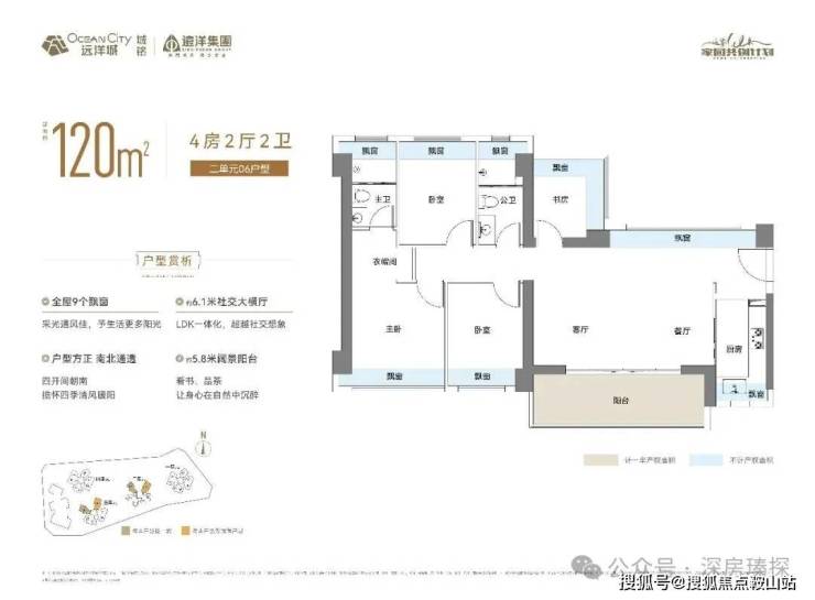 120㎡的4房2厅2卫,设计的是横厅南北通透格局,进门独立玄关,客餐厅6.1米开间,LDKB一体化,四开间朝南,主卧双飘窗通透设计,全屋9面凸窗,L型厨房,卫生间干湿分离,得房率约76.2%(不含赠送),客餐厅出5.8米长的阳台主朝西南或东南向。