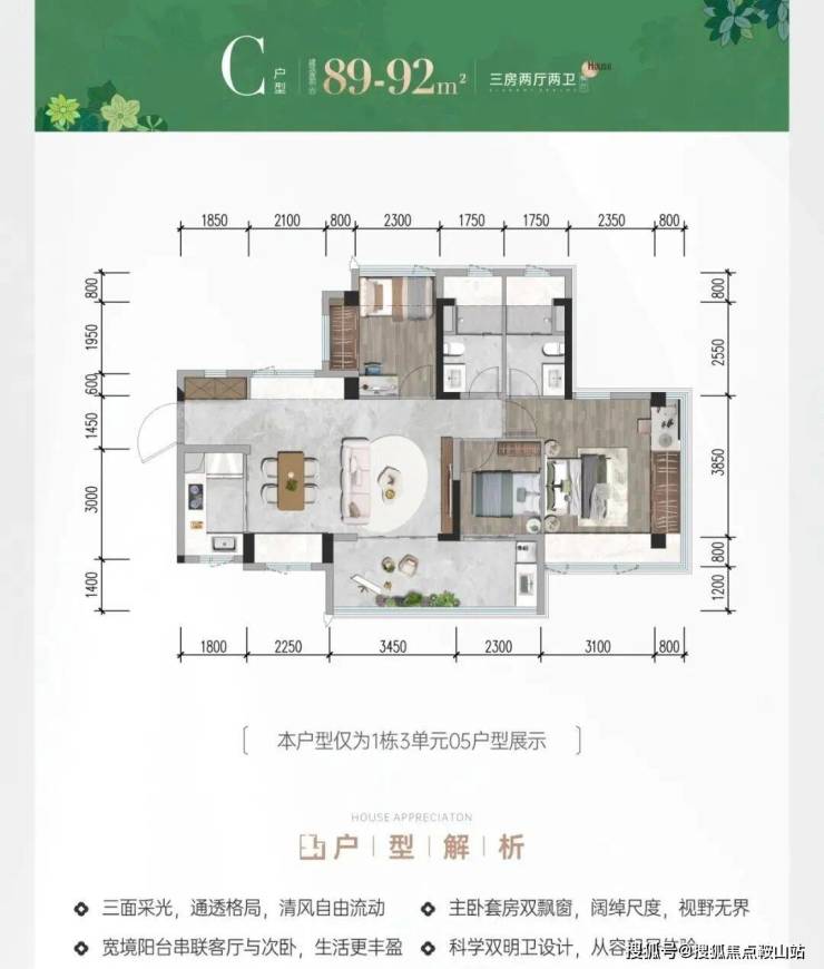 91㎡三房二卫(竖厅):双面L型主卧飘窗,全屋舒阔尺度;