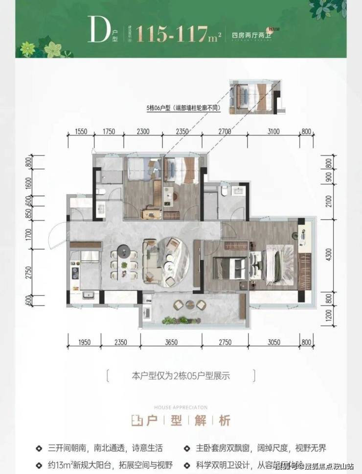 117㎡四房二卫:南北通透,约13㎡新规大阳台,尊享舒适;