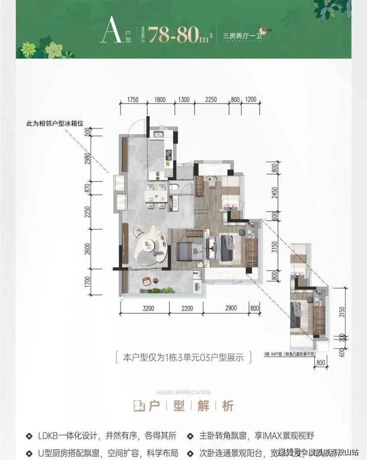 80㎡三房 一卫:约5.4m宽境阳台,三开间向阳;