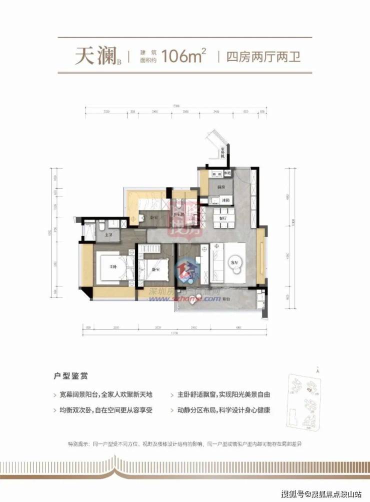 建面约106㎡天澜,四房两厅两卫,是项目可提供的最大面积户型产品,,西南朝向看花园景观(另1#栋的东南朝向,仅剩个位数房源)。