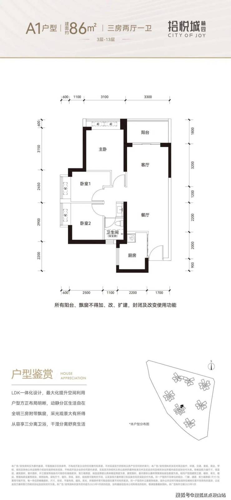 86㎡三房两厅一卫:总价330万起,面向园心,全景视野享四季美景,餐客厅ldk一体化设计,欢聚时刻不受限,动静分区,互不干扰,三分离卫浴,从容有序。