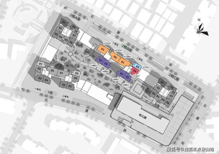 小区分布:5栋建筑主体组成,分为1/2/3栋,其中1栋分为1单元和2单元,2栋分为ABC座,2栋B座由1/2单元组成,3栋为幼儿园;