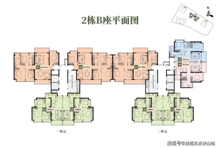 2栋B座一单元01、04户型、2栋B座二单元01户型:面积约为137-138㎡的4房2厅2卫;
