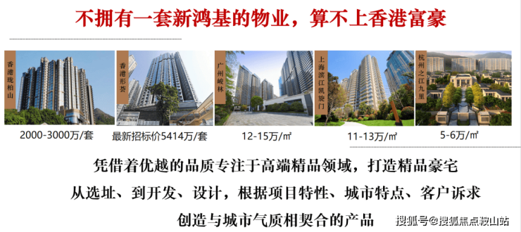 新鸿基只做豪宅和地标两种产品,旗下物业涨幅高达300%,坐享升值最强保证,多个项目创全球/当地高价,如香港天玺均价100万/㎡、上海凯旋门均价25万/㎡,广州天河峻林超16万/㎡
