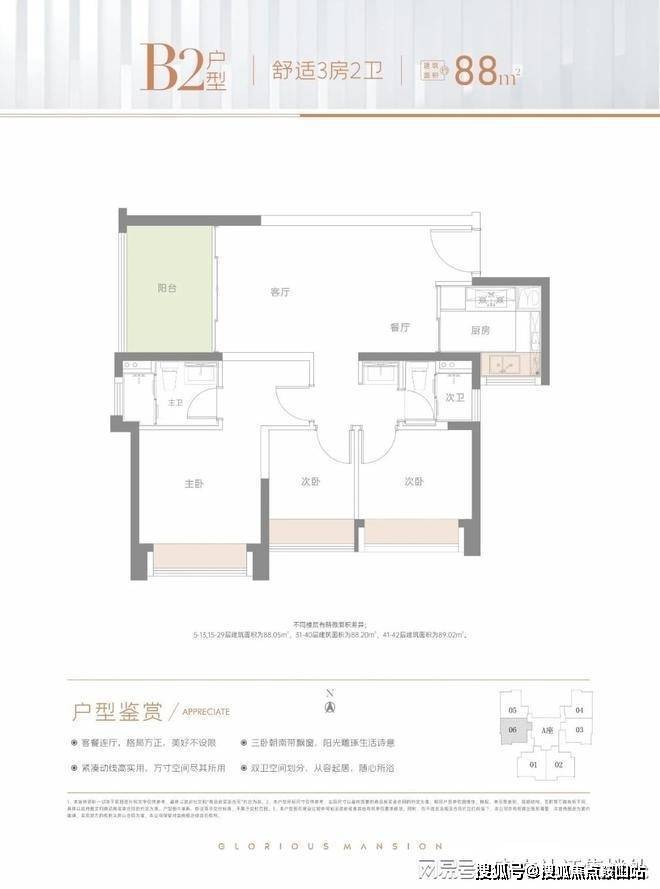 88㎡的3房2厅2卫:仅1栋A座06户型才有,设计的是竖厅格局,客厅3.35米开间,LDKB一体化,动静分区,3个卧室分别做到了3.2米/2.95米/2.25米的宽度,卧室全南向,U型厨房,公卫三段式分离,阳台正东朝向。