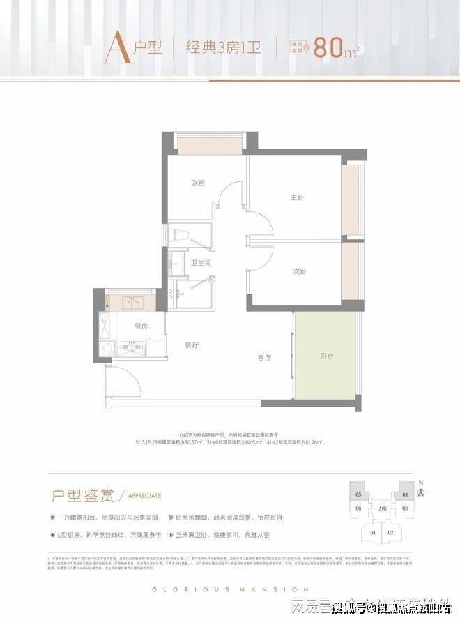 80㎡的3房2厅1卫:1栋A座04.05户型,设计的是竖厅格局,客厅3.3米开间,LDKB一体化,动静分区,3个卧室分别做到了3.1米/2.9米/2.35米的宽度,次卧双飘窗设计,U型厨房,创新式三分离卫生间,阳台有朝正西向或正东向。