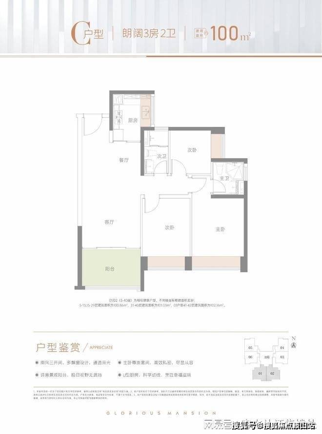 100㎡的3房2厅2卫:1栋A座01.02户型,设计的是竖厅格局,客厅3.55米开间,LDKB一体化,动静分区,三开间朝南,3个卧室分别做到了3.15米/2.85米/2.5米的宽度,U型厨房,卫生间干湿分离,阳台正南朝向。