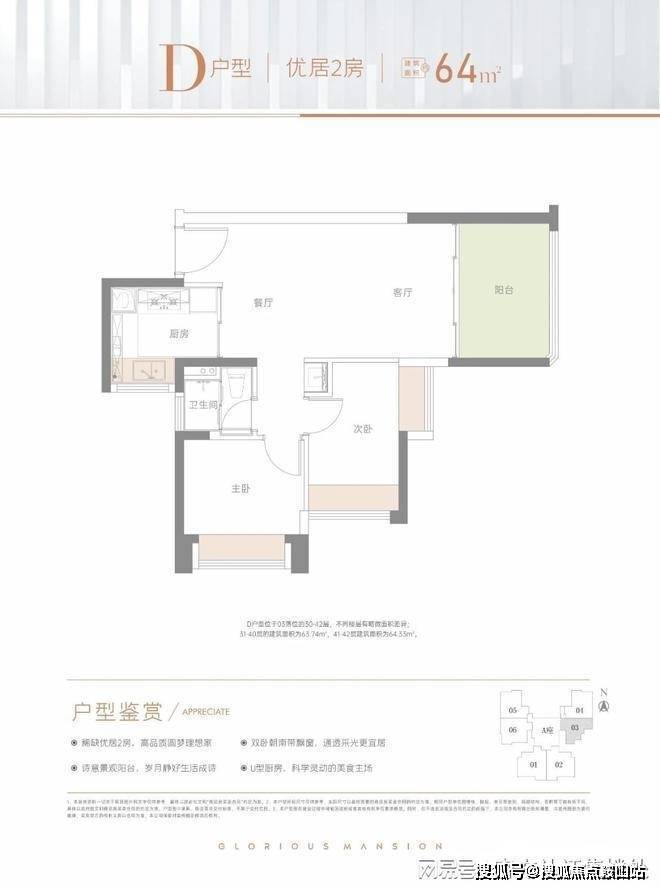 64㎡的2房2厅1卫:仅1栋A座03户型才有,设计的是竖厅格局,客厅3.35米开间,LDKB一体化,2个卧室做到了2.95米/2.25米的宽度,双卧室朝南向,次卧双飘窗设计,U型厨房,卫生间干湿分离,阳台朝正东向。