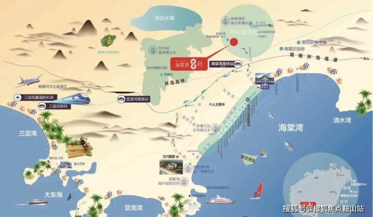 项目周边生态环境优良、配套成熟齐备:雄踞南田温泉度假区,临近免税购物中心,国际 品牌滨海酒店带、三大国际高尔夫俱乐部、亚洲较大海洋公园、解放军301医院环伺湾区。海棠湾8号,真正提供给业主生活、休闲、娱乐、旅游、度假、生态健康等全方位齐全配套资源,让业主轻松享受旅游度假,让生态养老生活尊享无限惬意。