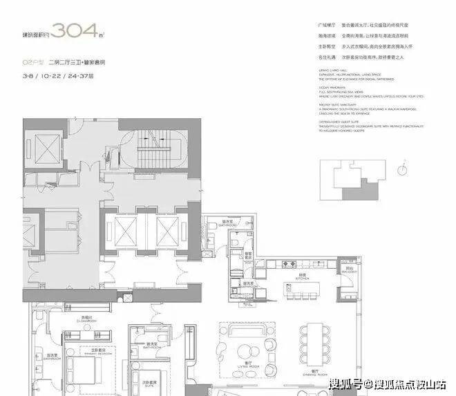 主力户型分析:项目主力户型涵盖建面约303-1032㎡的大平层及顶层复式,全系产品由Yabu Pushelberg、Kelly Hoppen、关永权等国际顶尖设计大师联袂操刀,采用全玻璃幕墙,层高约3.6-4.5米,均通燃气并配备超大观景阳台。其中,约303㎡户型为两房三卫,采用横厅设计;约327㎡户型为三房四卫,配备家政套间及270°环幕视野;约402㎡户型为四房四卫,南北通透;约1032㎡顶层复式为整层一户,配备独立电梯厅及直升机停机坪。