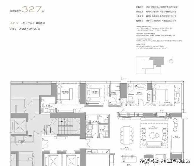 (3-57层)T3栋 四房四卫+家政套间。中西厨分区,餐客西厨一体,带多功能房。端头位置,三面采光。功能完备,房间数充足;实现了主仆双动线;会客观景视野一流。