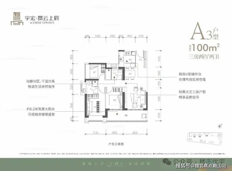100㎡的3房2厅2卫,设计的是竖厅格局,客厅3.6米开间,LDKB一体化,三开间朝南,3个卧室分别做到了3.1米/2.6米/2.4米的宽度,客厅连接次卧出6.2米长的大阳台,U型厨房,卫生间干湿分离,得房率约76%(不含赠送),东南朝向。