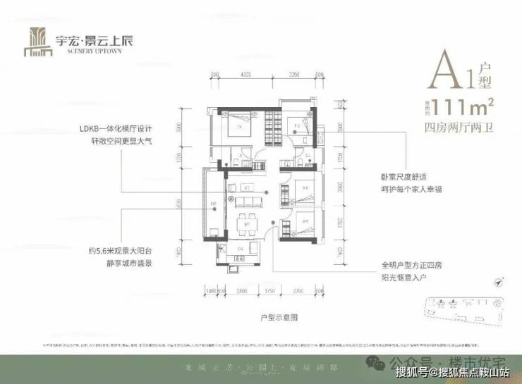 111㎡的4房2厅2卫,设计的是横厅南北通透格局,客餐厅5.6米开间,LDKB一体化,五开间朝南,4个卧室分别做到了3米/3米/2.9米/2.7米的宽度,客厅连接餐厅位出5.6米长的大阳台,L型厨房,公卫生三段式分离,得房率约76%(不含赠送),阳台主朝西南向
