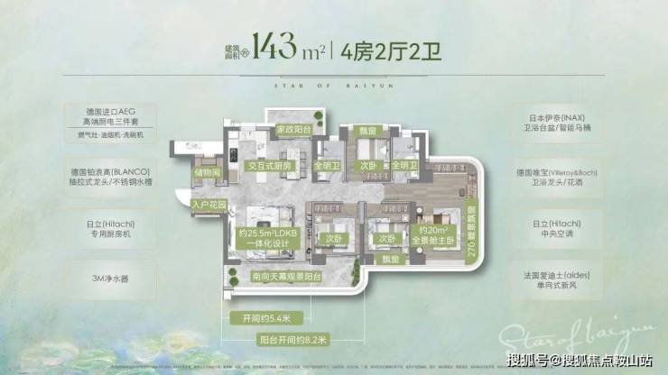 宽境奢宅:迭代新规户型,超100%实用率,约3.1-3.3米层高,南北通透双阳台,LDKB-X百变交互场景,主卧270°宽幕飘窗(部分户型)。