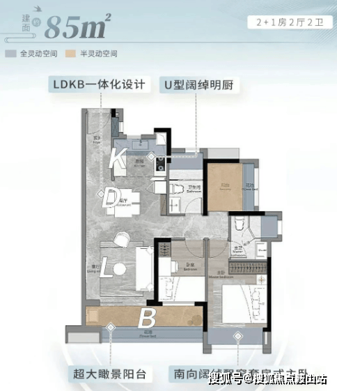 84㎡三房两厅两卫:南向双瞰景阳台,U型明厨,南北对流设计。