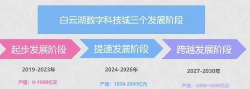 根据《白云湖数字科技城建设总体方案》,该区域的建设分为三个阶段进行:起步发展(2019-2023年)、提速发展(2024-2026年)和跨越发展(2027-2030年)。自2018年起,区域内的征拆、收储和出让地块工作已逐步展开,基础设施项目也相继开工建设,显示出较快的发展速度和发展潜力。