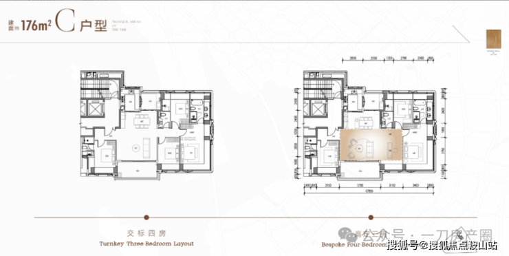 176㎡四房:位于1、2栋,2梯2户,层高3.3米。竖厅南北通透格局,双阳台,五开间朝南,双套间设计。